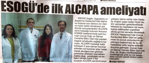 ESOGÜ Sağlık, Uygulama ve Araştırma Hastanesi’nde teşhis ve tedavisi son derece zor olan ve hiçbir belirti olmaksızın ani ölümle sonuçlanabilen ALCAPA isimli hastalığı bulunan Arzunur KÖKEN hastanemizde yeni kurulan Çocuk Kalp ve Damar Cerrahisi Bilim Dalı’nda yapılan başarılı ameliyatla sağlığına kavuştu. ALCAPA hastalığı kalbi besleyen 2 ana damar koroner arterden sol koroner arter hatalı olarak akciğere kan götüren pulmoner arterden kaynaklanmakta olup, yenidoğan ve yetişkin olmak üzere 2 tipi bulunan ALCAPA sendromunun yetişkin tipine sahip olan hastalar erişkin yaşa kadar hiçbir belirti vermeden gelebilmektedir. Nitekim bu hastaların bir kısmı teşhis edilmeden yaptıkları eforla ani bir esnada ölmektedir. ESOGÜ Hastanesi'nde Çocuk Kardiyoloji Bilim Dalı'nın gelişmesi ve çocuk anjiyolarının yapılmaya başlanması ile bu tür